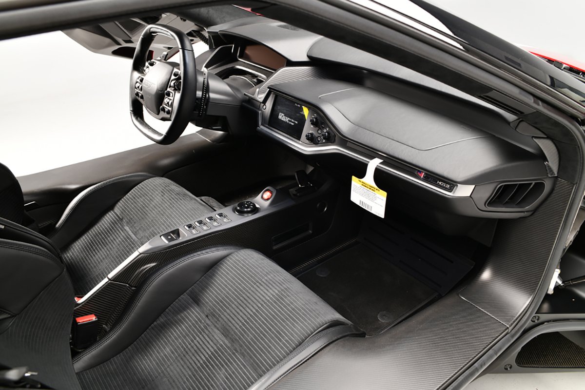 This Ford GT features over $50,000 in options; The exterior is finished in Liquid Red paint with Frozen White racing stripes and accented with matte-finish carbon-fiber components courtesy of the extended Carbon Fiber Package. The interior features a leather-wrapped steering wheel and the Dark Energy Interior Package upgrade, as well as factory-installed 6-point harness mounting points.