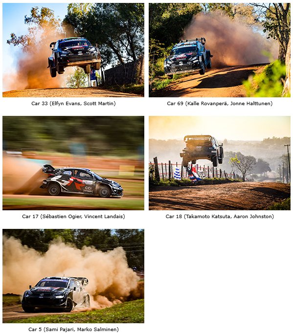 Friday’s opening leg was the longest of the rally, featuring two loops of four stages totalling 140.9 competitive kilometres. The first stage, Cambyretá, would prove to be the most demanding of the day with many large bumps and compressions providing a test for cars and tyres, but TGR-WRT made a good start with Rovanperä quickest ahead of his team-mates Sébastien Ogier and Sami Pajari.