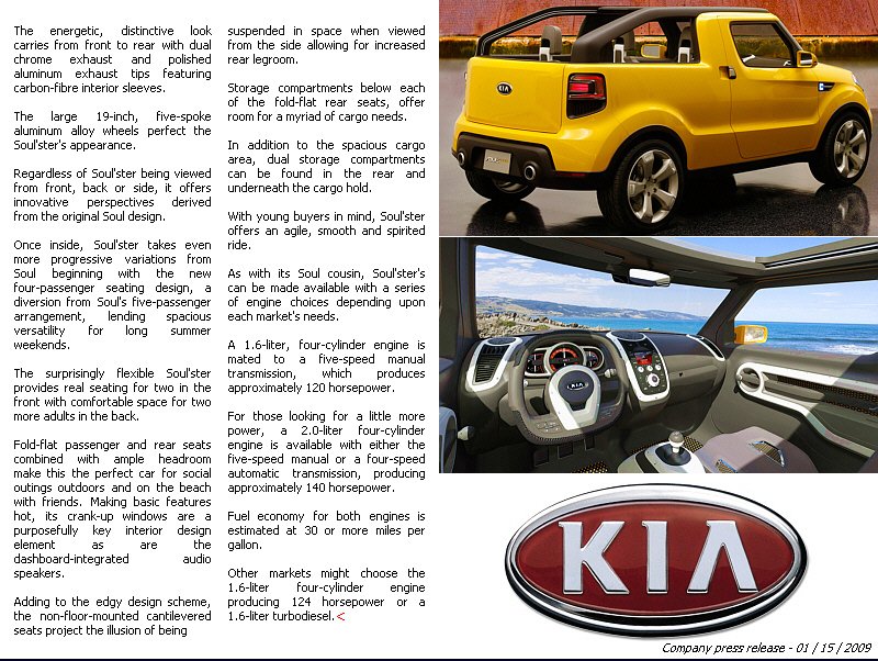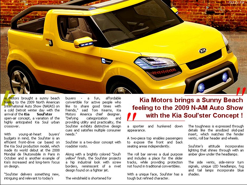In the past, we've had confirmations of the Aston 177, the Renault Ondelios and a number of predictions in A1GP and F1GP. In this case though, we get a confirmation of an earlier concept becoming reality, and a supercar from Galmer about to be released globally from their HQ in Thailand. 1) Kia Soul: In Edition 24 - The Summer 09 Edition, we reported that Kia had unveiled a concept by the name of The Soulster at the North American International AutoShow. The photos to the right reveal a Kia being driven around the main streets of Korea where Kia head quarters are. The body work, some trim and interior are remarkably close to those reported to us by the company earlier this year. This specific example is the 4 door variant without the removable panel roof. ________________________________________________________________ 2) Galmer GT: More exciting still, is the confirmation of previously rumoured information on the Galmer GT by Cobra International. Although some internet hype shows typically 3d rendered drawings and computer designs, we were hesitant to jump on the bandwagon until our own resources were able to confirm information directly from the Cobra International HQ in Thailand. We can confirm that the car is indeed in production and due for release later this year. Depicted here is our interpretation of the rear end aerodynamics and diffusion design. Typical of most top end SuperCars, the Galmer GT addresses front end and chassis stability whilst capturing the air rushing in the under carriage to provide cooling for brakes, engine bay and diffusion of the rear end. The rear spoiler is there of course to generate the down-force necessary to hold that rear end firmly on the ground. Although there is still little `official' information available on true `on road' performance, we expect that this would be a mid 3 second car at the 0 - 100k rating, with a top speed approaching 300kph. When you consider that the boys at Cobra Int decided to drop the aging and maxed out VW3.2ltr V6 engine, for the new headroom abundant Chevrolet LS7 7ltr motor found in the Corvette, powering a lightweight all carbon fibre body, we feel we're not too far off the mark with those numbers !